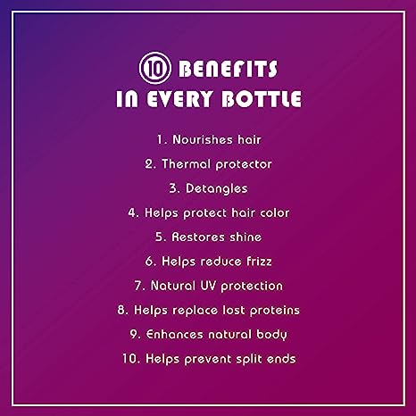 • This leave-in treatment spray for dry, damaged hair detangles, smoothes, adds shine, seals & protects hair color while boosting manageability, preventing hair breakage, protecting from heat styling.