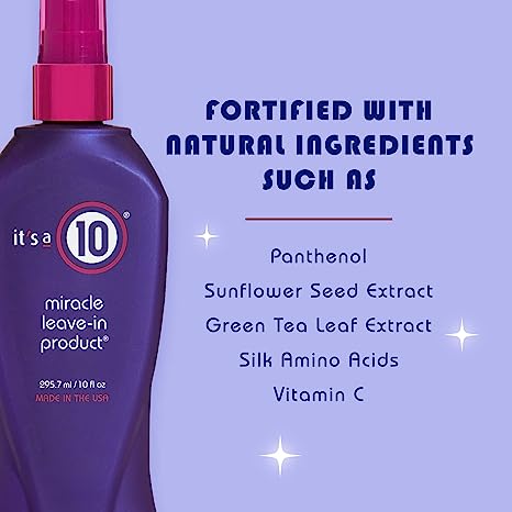 10 Haircare Miracle Leave-In Conditioner Spray – 10 oz. – 2ct Brand It’s a 10 Haircare Item Form Liquid Material Feature Natural Hair Type All, Chemically Treated Product Benefits Hydrating