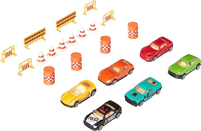 - Set includes 6 die-cast vehicles and 16 road accessories