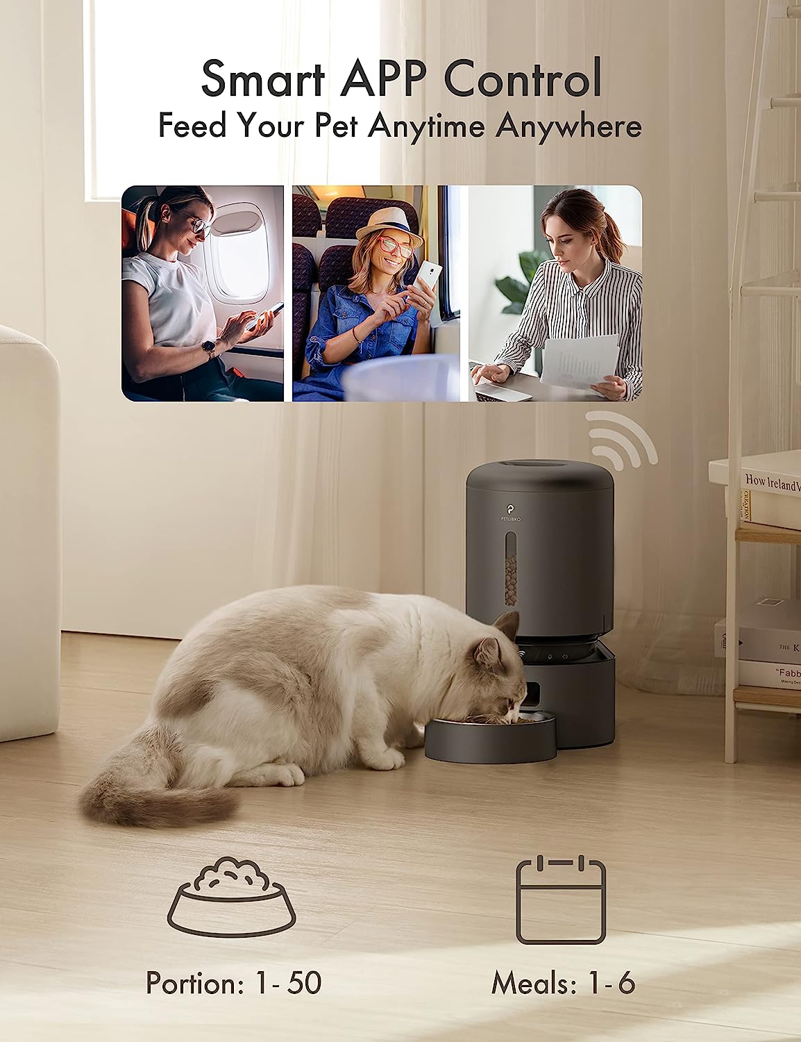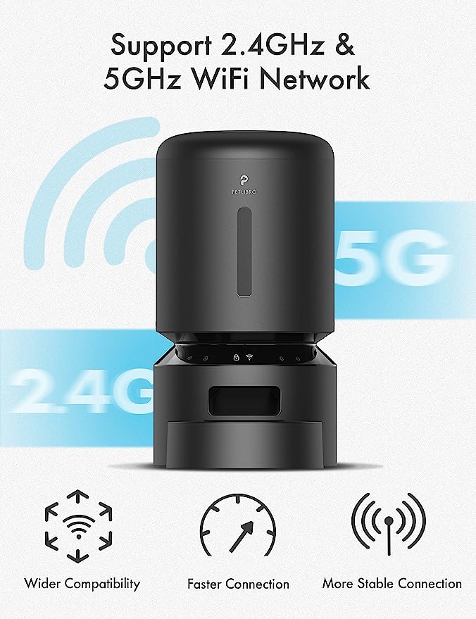 - Convenient APP Control: WiFi automatic cat feeder can connect to 5GHz and 2.4GHz WiFi network. Program and monitor your pet’s meals anywhere anytime through the PETLIBRO LITE App on your iOS or Android smartphone. You can set up to 10 meals per day with 1-50 portions per meal. You can check the feeding records to ensure your cat or dog has been fed on a set schedule by APP and also can be controlled from multiple family members’ smartphones.