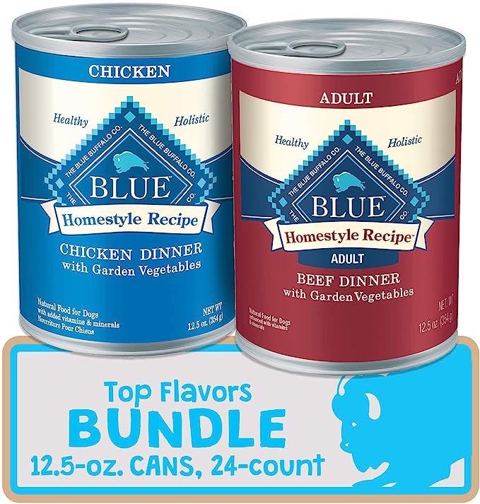 - Contains twenty four (24) 12.5-oz cans of BLUE Homestyle Recipe Natural Adult, Chicken or Beef
