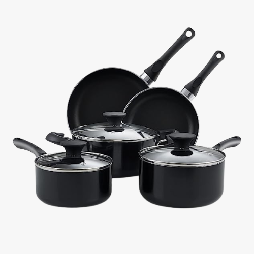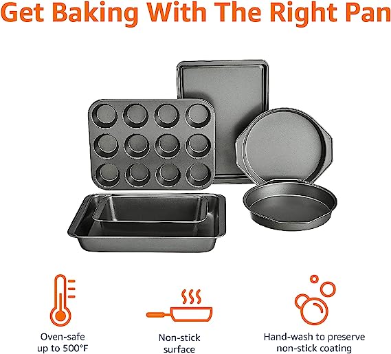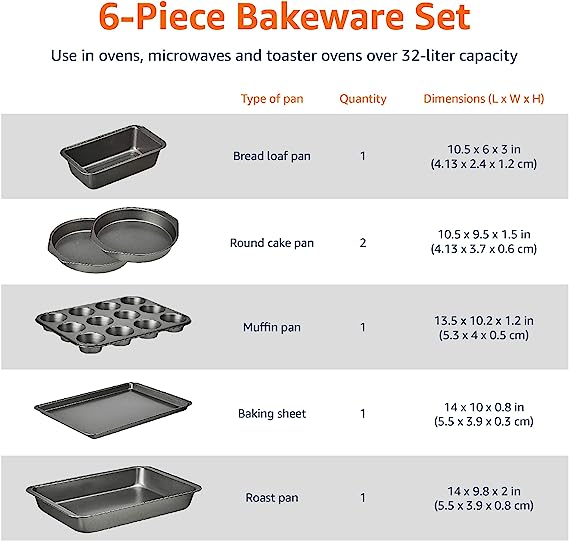 • 6-piece bakeware set includes a 9 x 5-inch loaf pan, 2 round 9-inch cake pans, a 12-cup muffin pan, a 13 x 9-inch roast pan, and a 13 x 9-inch baking sheet