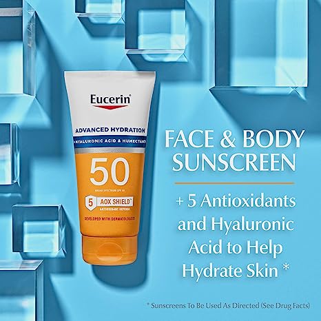 • Includes one (1) 5 fluid ounce tube of Eucerin Sun Advanced Hydration SPF 30 Sunscreen Lotion & one (1) 2.5 fluid ounce bottle of Eucerin Sun Age Defense SPF 50 Face Sunscreen Lotion