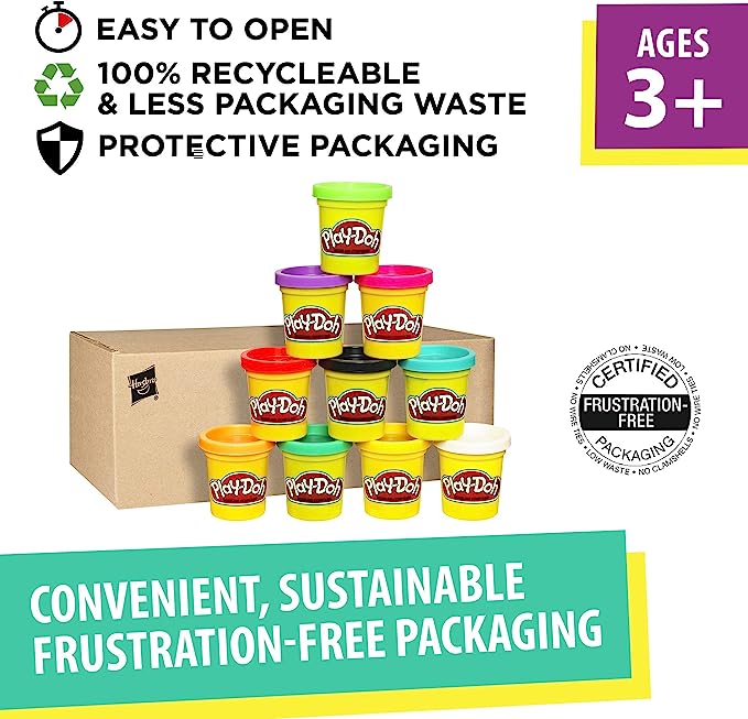 • Easy-open, recyclable package – SHIPS in simple recyclable packaging that’s easy to open and frustration free, and the Play-Doh cans and lids are also recyclable to help build a more sustainable world!
