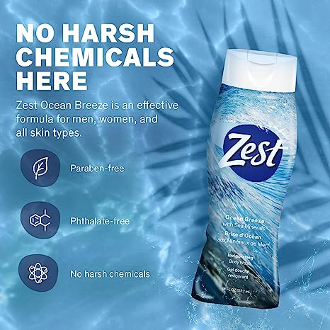 - NO HARSH CHEMICALS HERE: Zest Ocean Breeze is an effective formula for men, women, and all skin types. It’s paraben-free, phthalate-free, and contains no harsh chemicals.